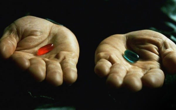 Una delle scene più belle, una di quelle su cui si basa l’intero film è quella in cui Morpheus offre a Neo la possibilità di scegliere. La scelta fra due pillole quella AZZURRA e quella ROSSA.